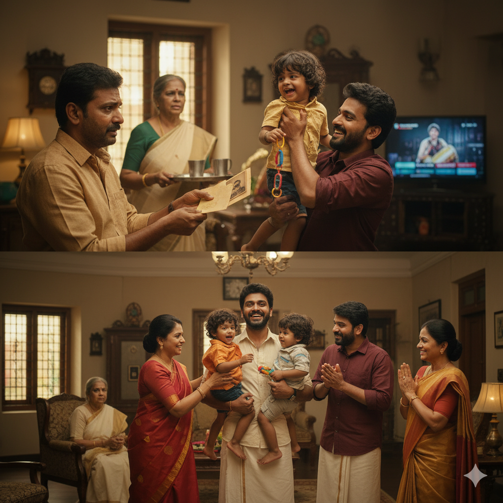 “ வந்தவுகளுக்கு காப்பி பலகாரம் எடுத்து வையுங்க “ என்று ஏவிய மாமியாரைப்பார்த்த சொர்ணக்கிளி நகர தொடங்க, அவரின் கைப்பற்றி தடுத்த வேதகௌரி,” வரும் போது தான் குடிச்சுட்டு வந்தோம்ம்மா..பிள்ளைகளுக்கு மட்டும் பால் ஆத்தனும்.. நீங்க உங்க பேரபிள்ளைகளோட இருங்க நான் செய்யறேன் “ என்றவள் சமையலறை நோக்கி சென்றாள்.